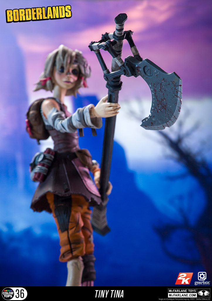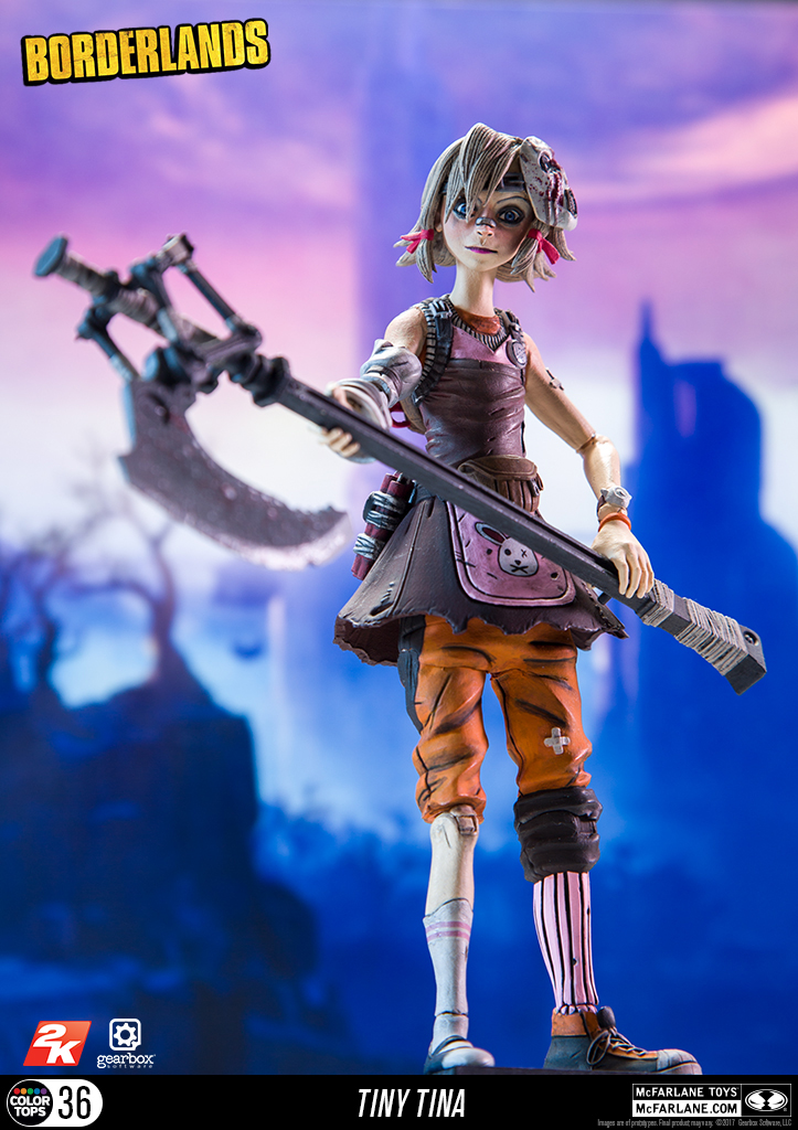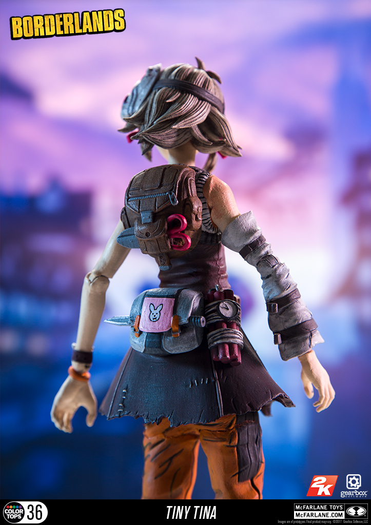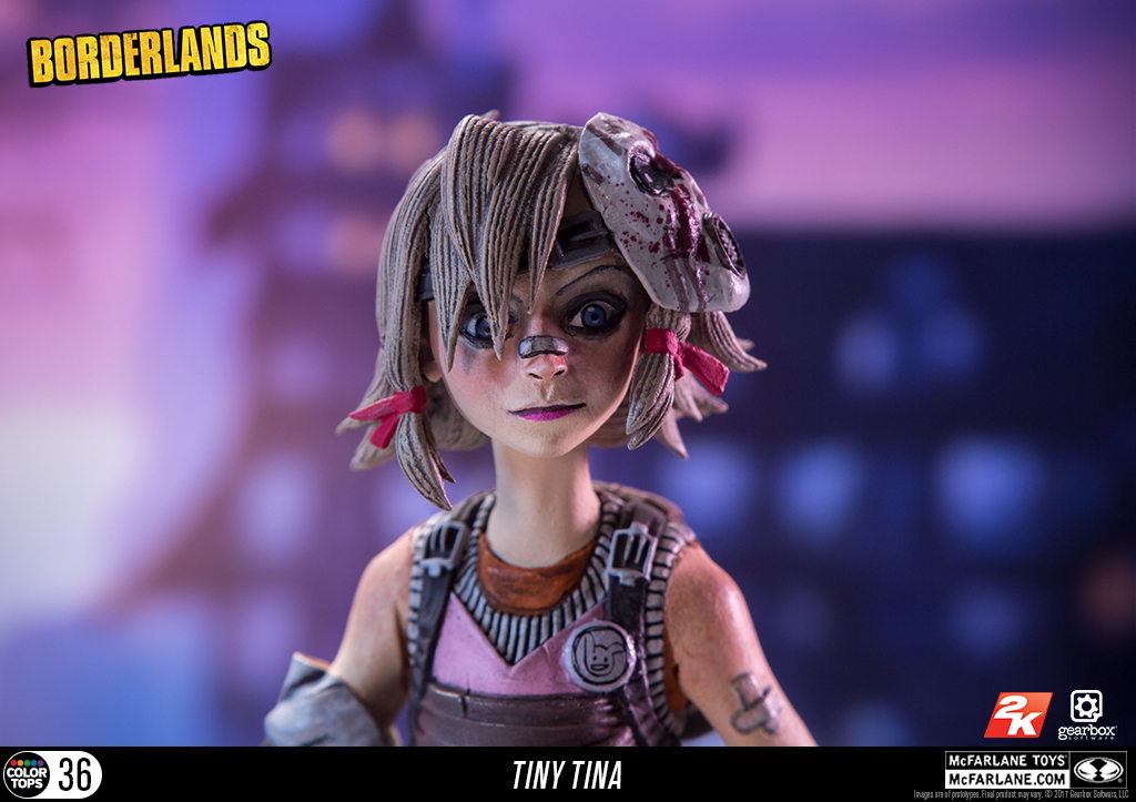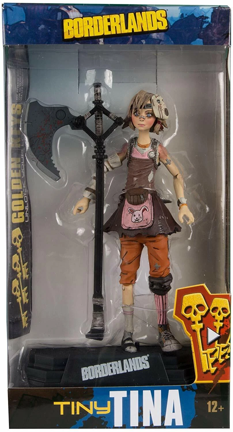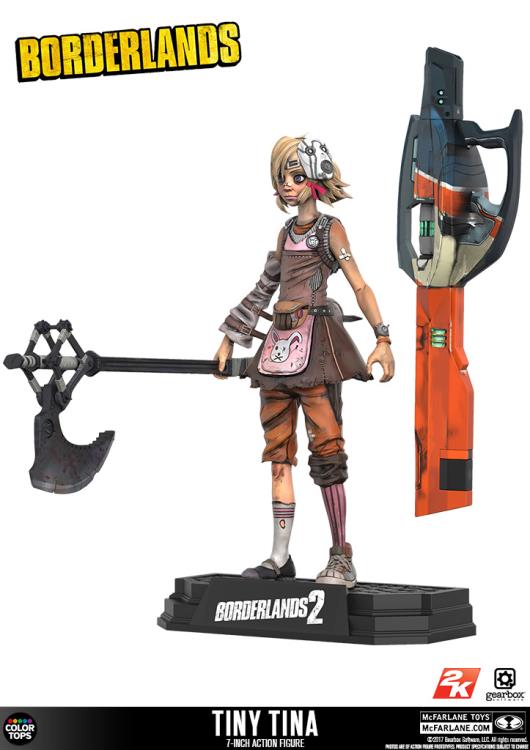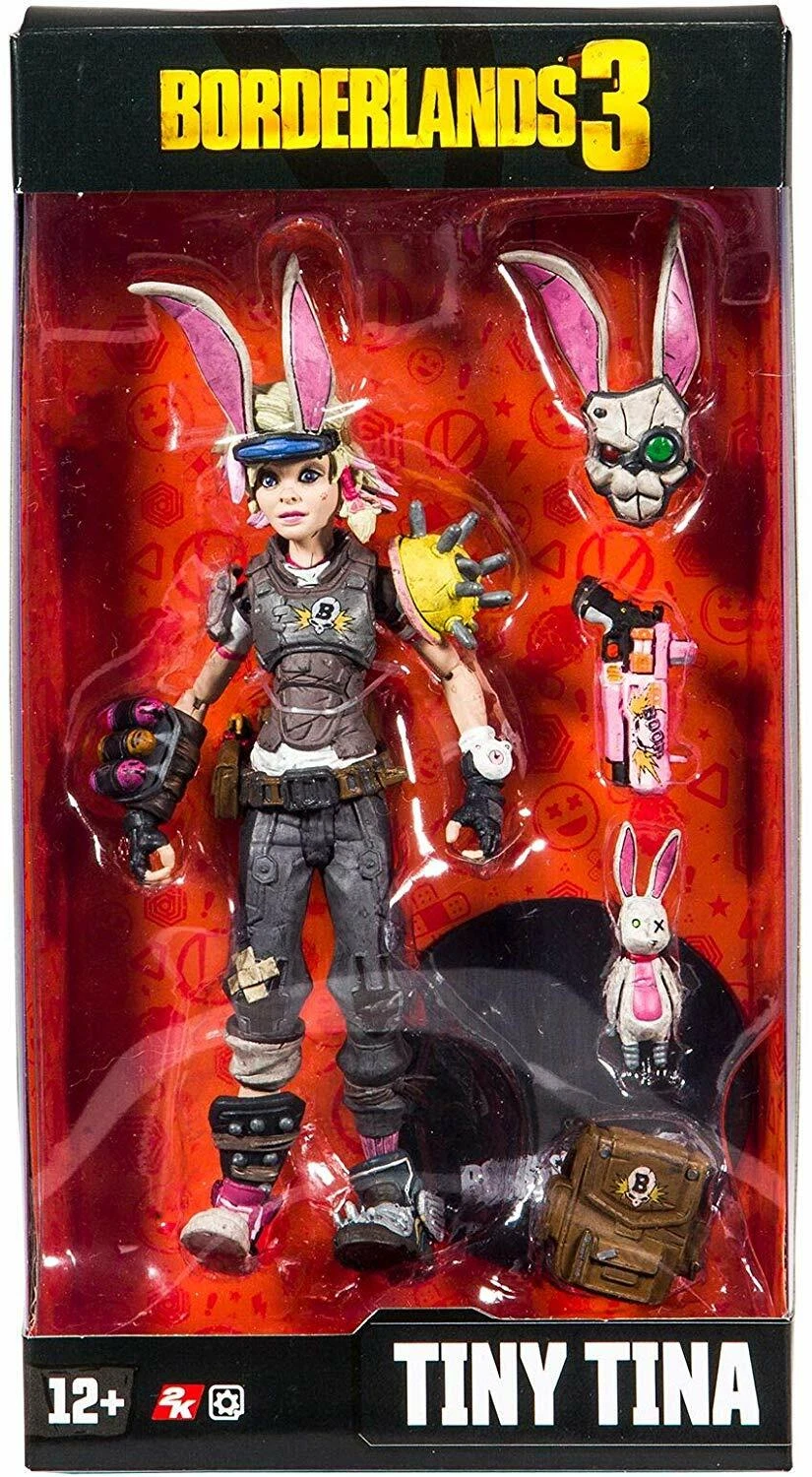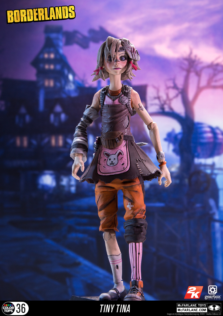 Borderlands Action Figure Set: Conjunto com 6 (seis) action figures de Borderlands, articuladas, detalhes impressionantes, acessórios, arma, etc. Medem aprox. 16 cm de altura. Fabricado pela Mc Farlane Toys.Este conjunto inclui: Lilith, Hansom Jack, krieg, Tiny Tina, Psicho e Tiny Tina Habbit mask.