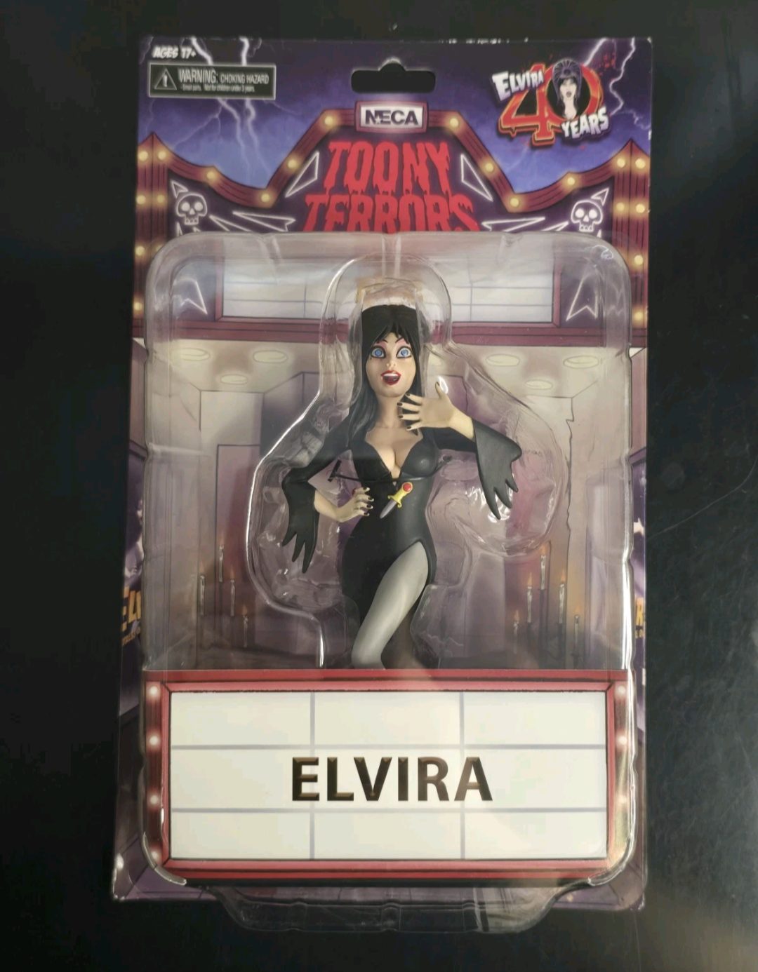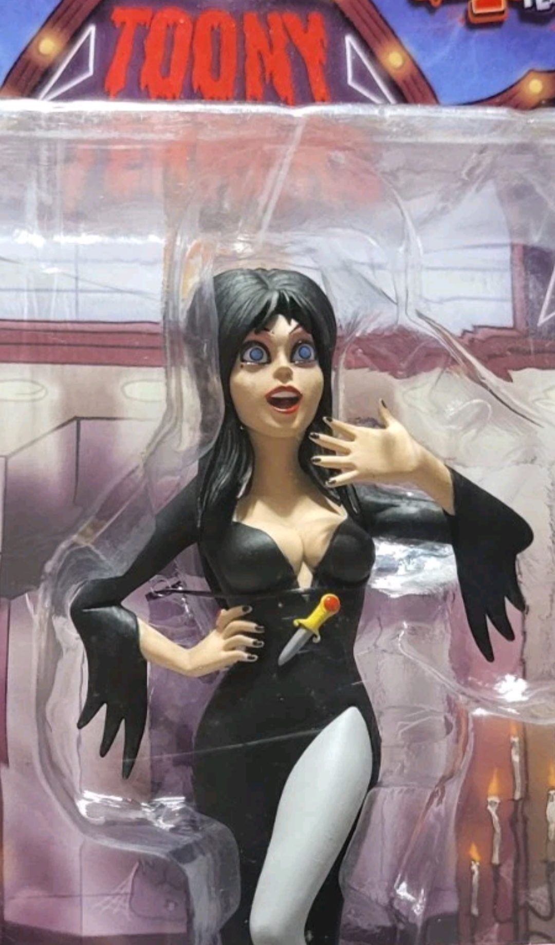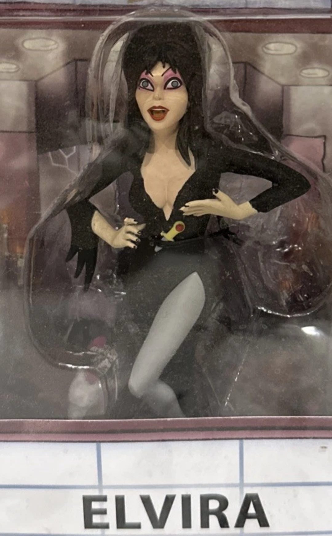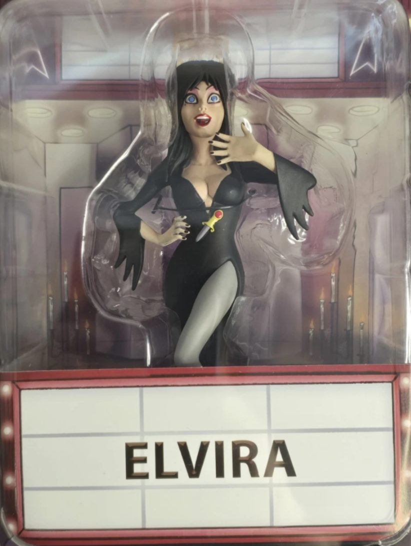 Elvira Action Figure. Figura em PVC, mede aprox. 12 cm de altura, detalhes autênticos, levemente articulada, cartela tem poster Back Drop. Fabricado pela Neca.