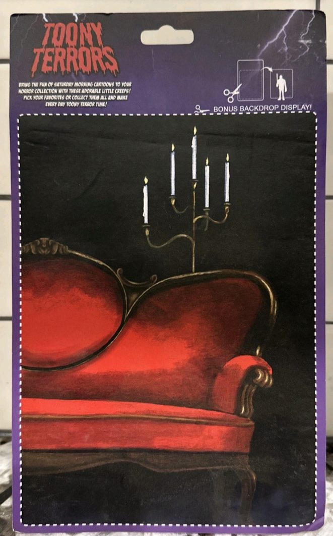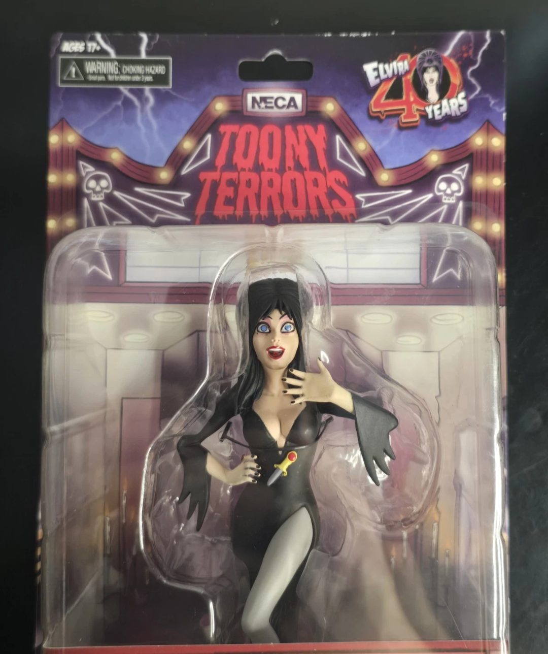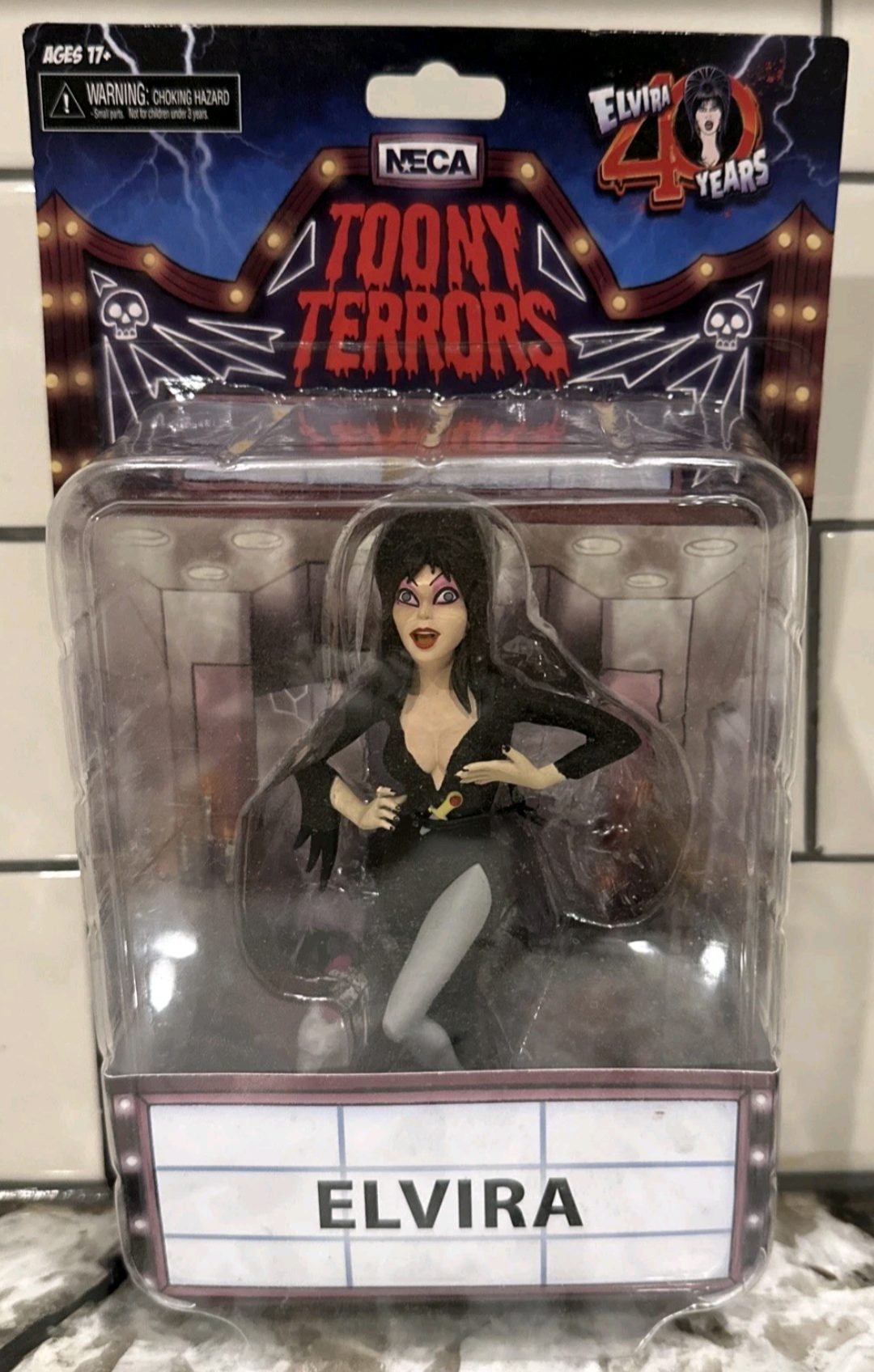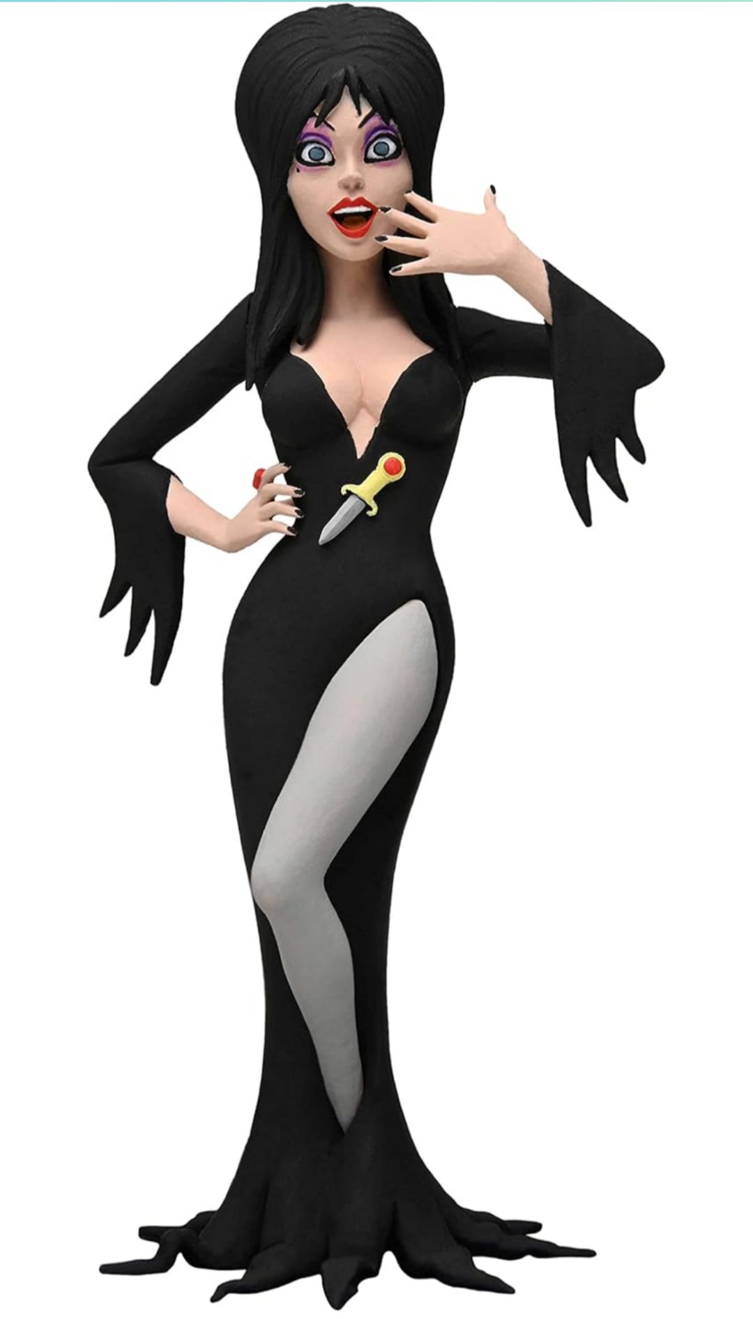 Elvira Action Figure. Figura em PVC, mede aprox. 12 cm de altura, detalhes autênticos, levemente articulada, cartela tem poster Back Drop. Fabricado pela Neca.