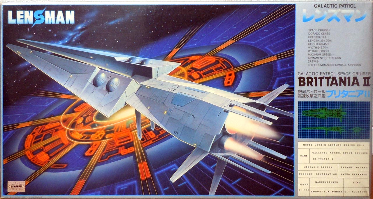 Lensman – Britania-II Spaceship. Kit para montar de plastimodelismo, requer montagem e pintura, super detalhado, opção de trens de pouso baixados ou em voo, suporte decorado, peça em metal, escala 1/1000 mede aprox. 30 cm. Fabricado pela Tomy do Japão.