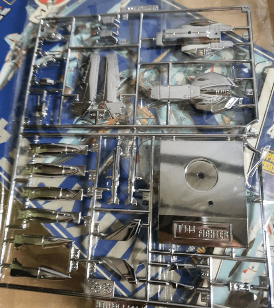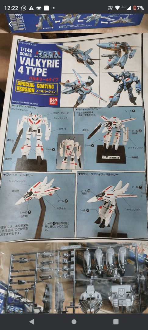 Macross Valkyrie 4 Type. Vintage Kit p/ montar de plastimodelismo, Edição Comemorativa de 15 anos de Macross, requer montagem, peças niqueladas, contém os 4 modos (Fighter, Stalking Fighter, Gerwalk e Battroid), na escala 1/144, fabricado pela Bandai.