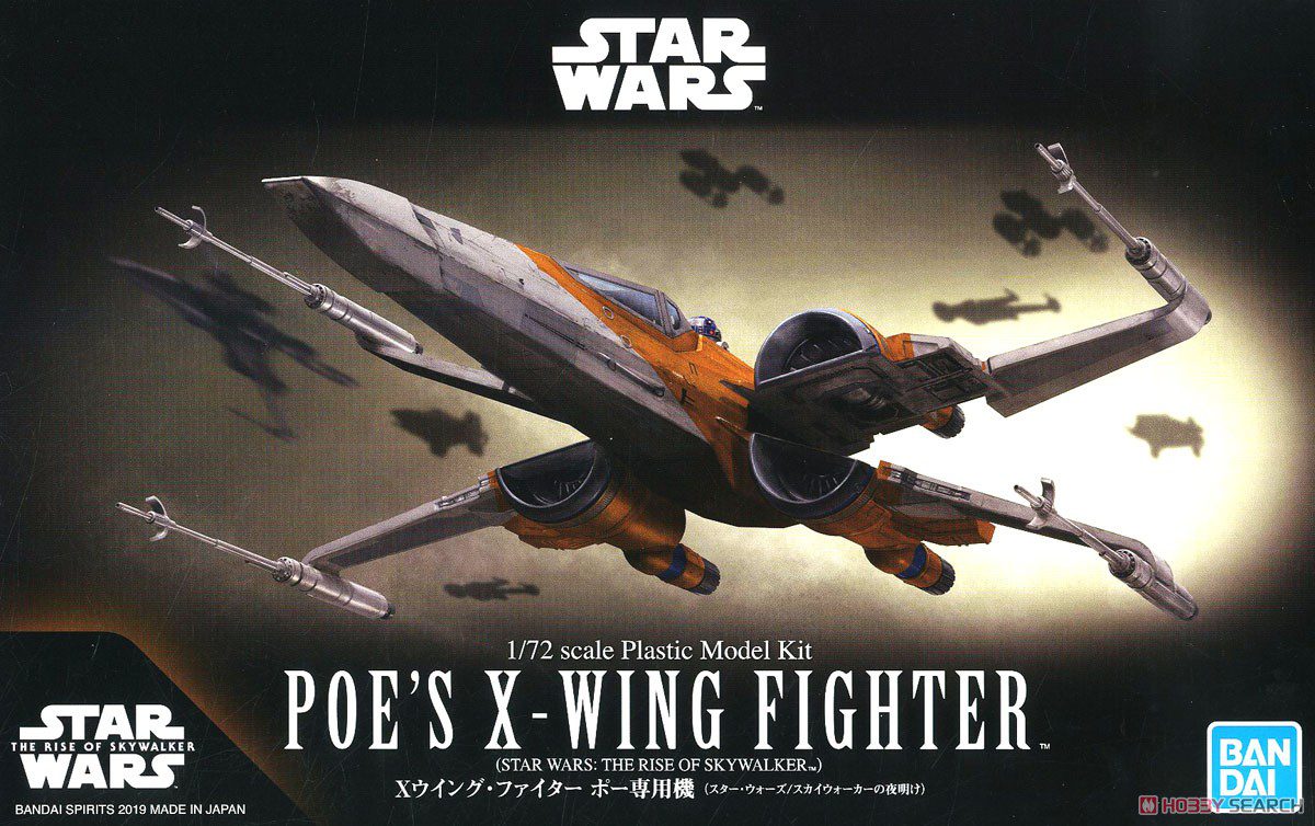 Poe Dameron T-70 X-Wing Fighter EP-09. Kit para montar de plastimodelismo escala 1/72, NÃO requer colar nem pintar, detalhes super autênticos da maquete original, interior de cockpit detalhado, pilotos incluídos, acompanha suporte/pedestal móvel, decais, mede aprox. 20 cm após montado, fabricado pela Bandai do Japão.