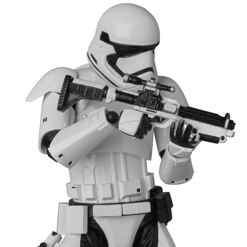 Star Wars First Order Stormtrooper Mafex Action Figure. Action Figure, totalmente articulada, acompanha diversos acessórios, opções de troca de mãos, Escudo, Bastão Elétrico, Armas pistola e rifle laser, suporte articulado, escultura realista, detalhes incríveis, mede aprox. 16 cm. Fabricado pela Mafex (Medicom) do Japão.